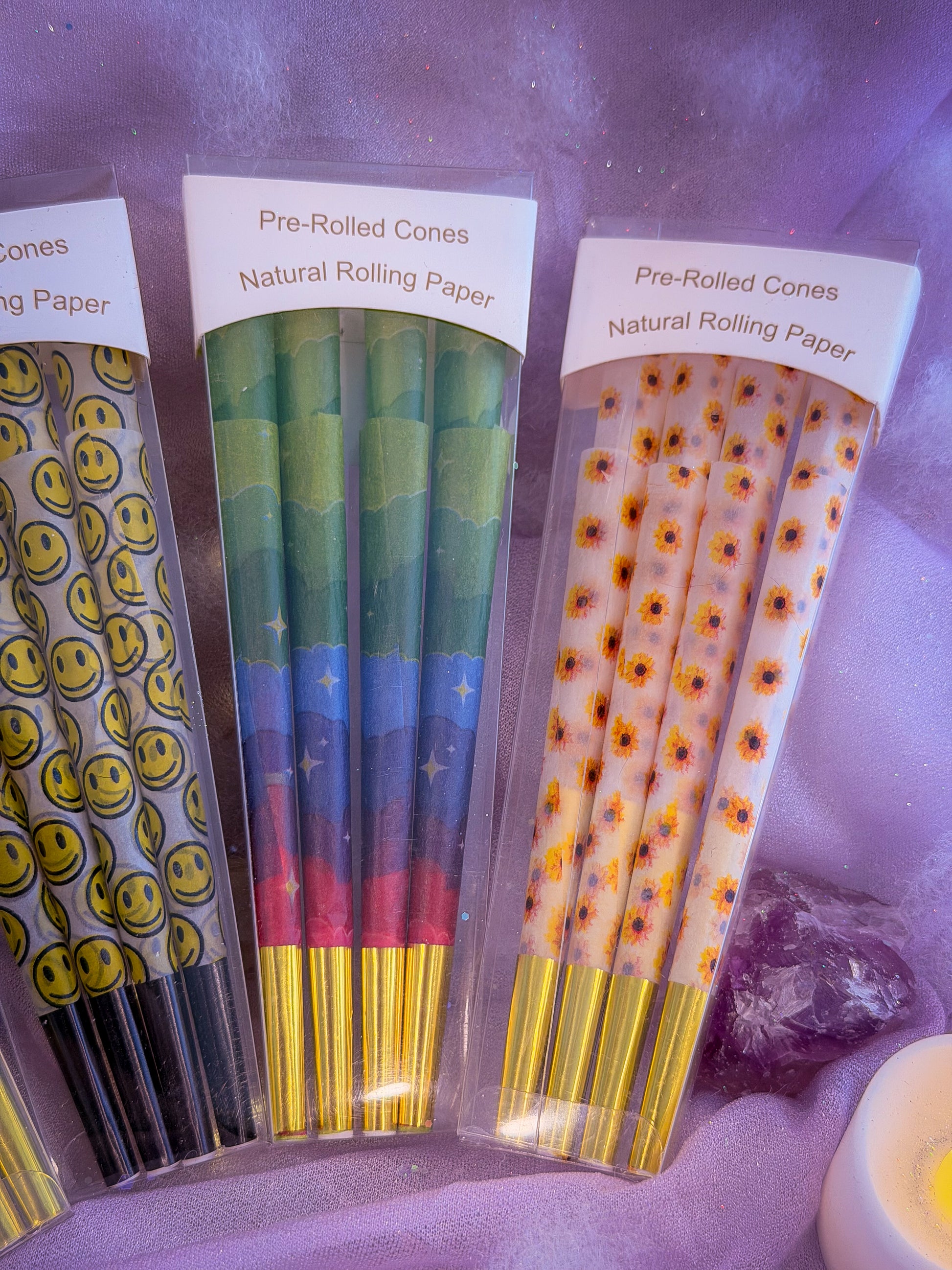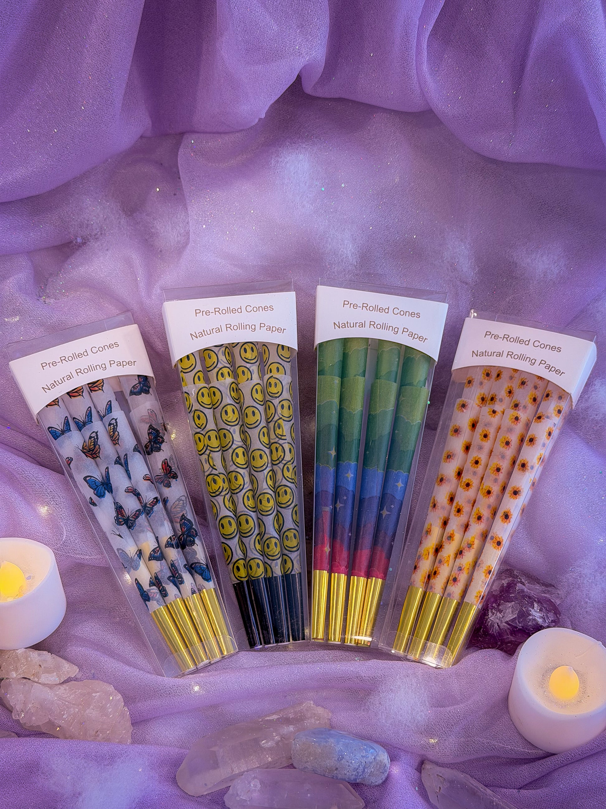 - 4 pack of 8 pre rolled cones - Butterflies, Rainbow, Smily and Sunflowers