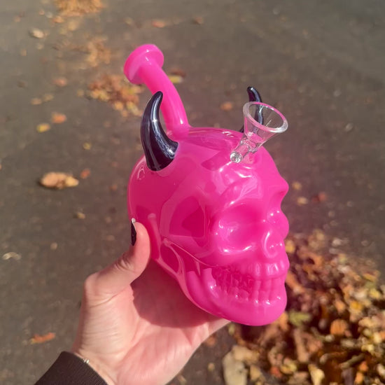 Unleash your dark side in style with this limited edition Pink Iridescent Devil Skull Bong. Part of the exclusive Pretty Deadly Collection, this piece combines edgy gothic vibes with playful feminine flair - a deadly beauty for your next smoke session.